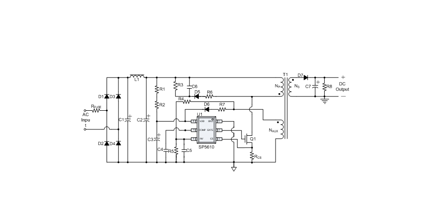 SP5610是一顆高精度離線式開關(guān)電源電路,應(yīng)用于低功耗AC/DC充電器與適配器。SP5610使用原邊取樣來進行精確的恒流、恒壓控制,可以省去一般應(yīng)用中的光耦與TL431。